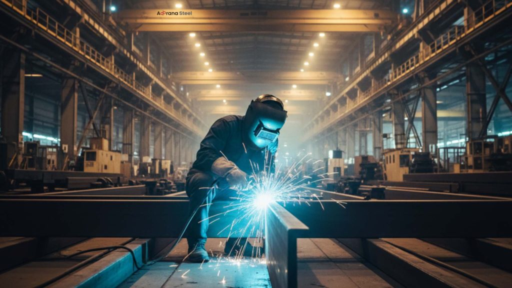 Proses fabrikasi dan pemasangan baja sesuai desain dengan standar K3.